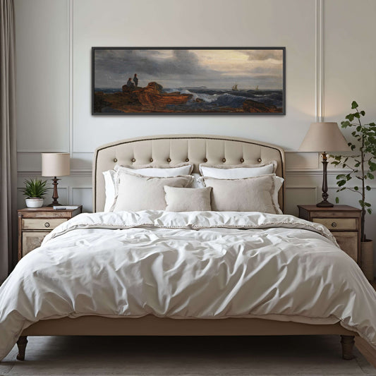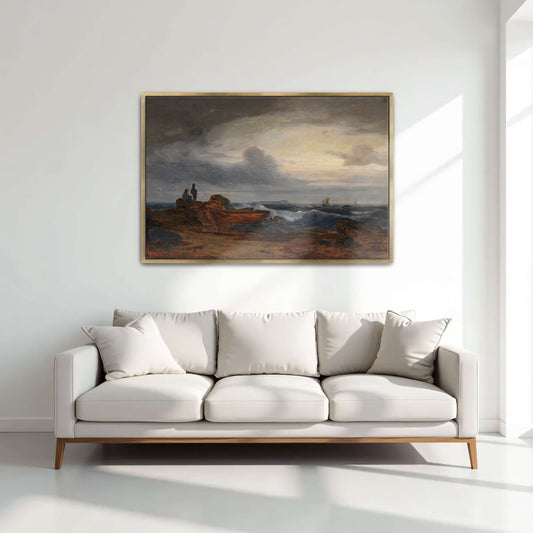 Two Figures On A Rocky Shore With Boats And A Distant Sailboat Under A Cloudy Sky By Karl Hagemeister