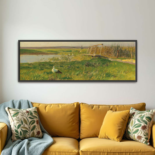 Stork In Grassy Meadow With Wooden Bridge By Eugen Jettel