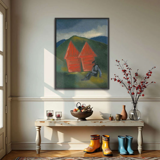 Two Red Barns And A Figure In A Green Landscape By Mikuláš Galanda