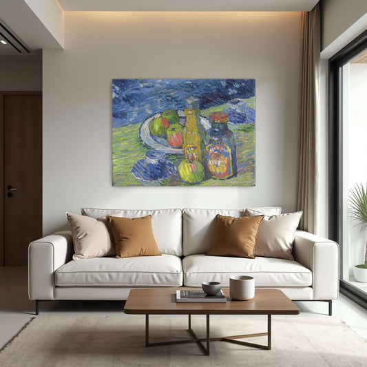Still Life With Bottles And Fruit In A Blue Landscape By Alexej Von Jawlensky