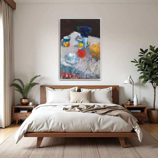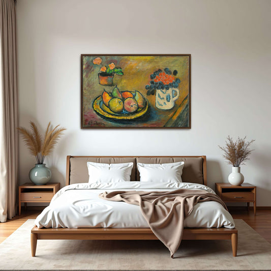 Still Life With Flowers, Fruit And Cloth On Table By Alexej Von Jawlensky