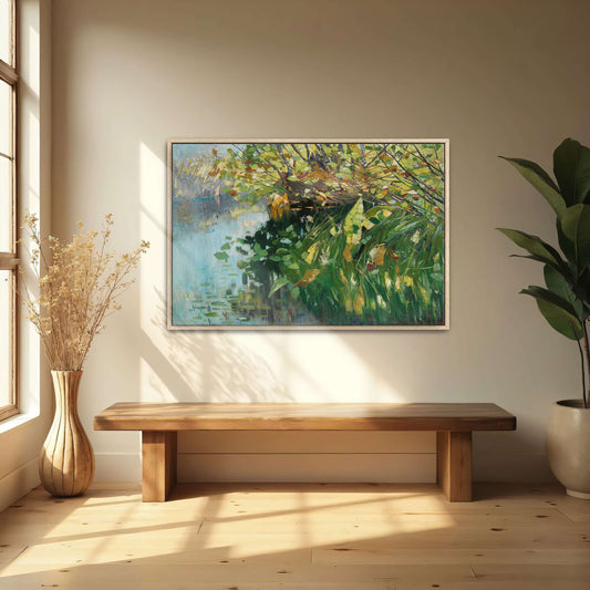 Lush Green Foliage, Water Reflections, Misty Morning, Sunlit Leaves, Vibrant Colors, Impressionistic Brushstrokes By Karl Hagemeister
