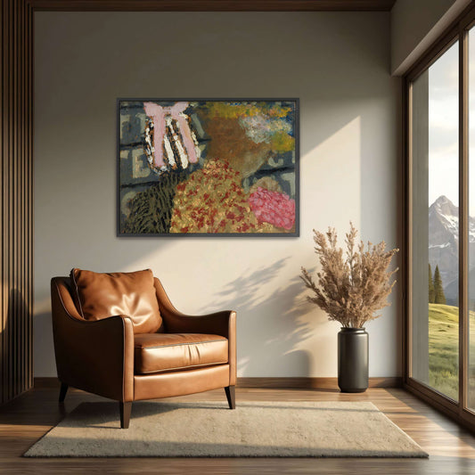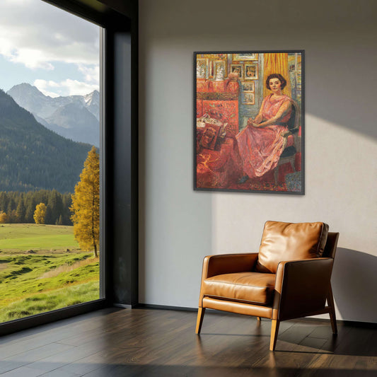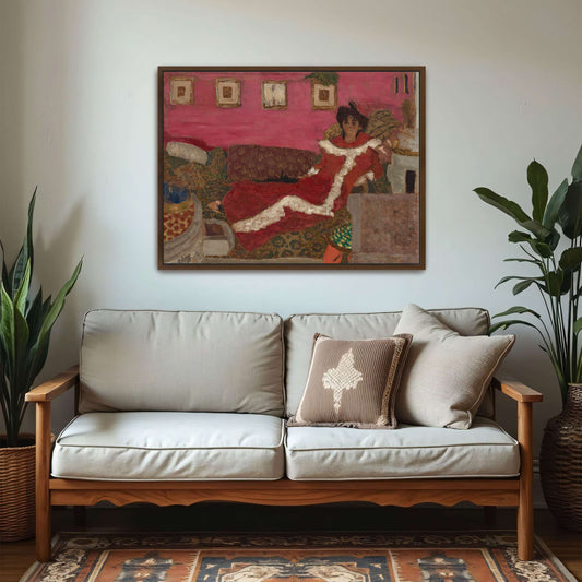 Woman In Pink Dress Sitting In Interior With Pictures By Édouard Vuillard