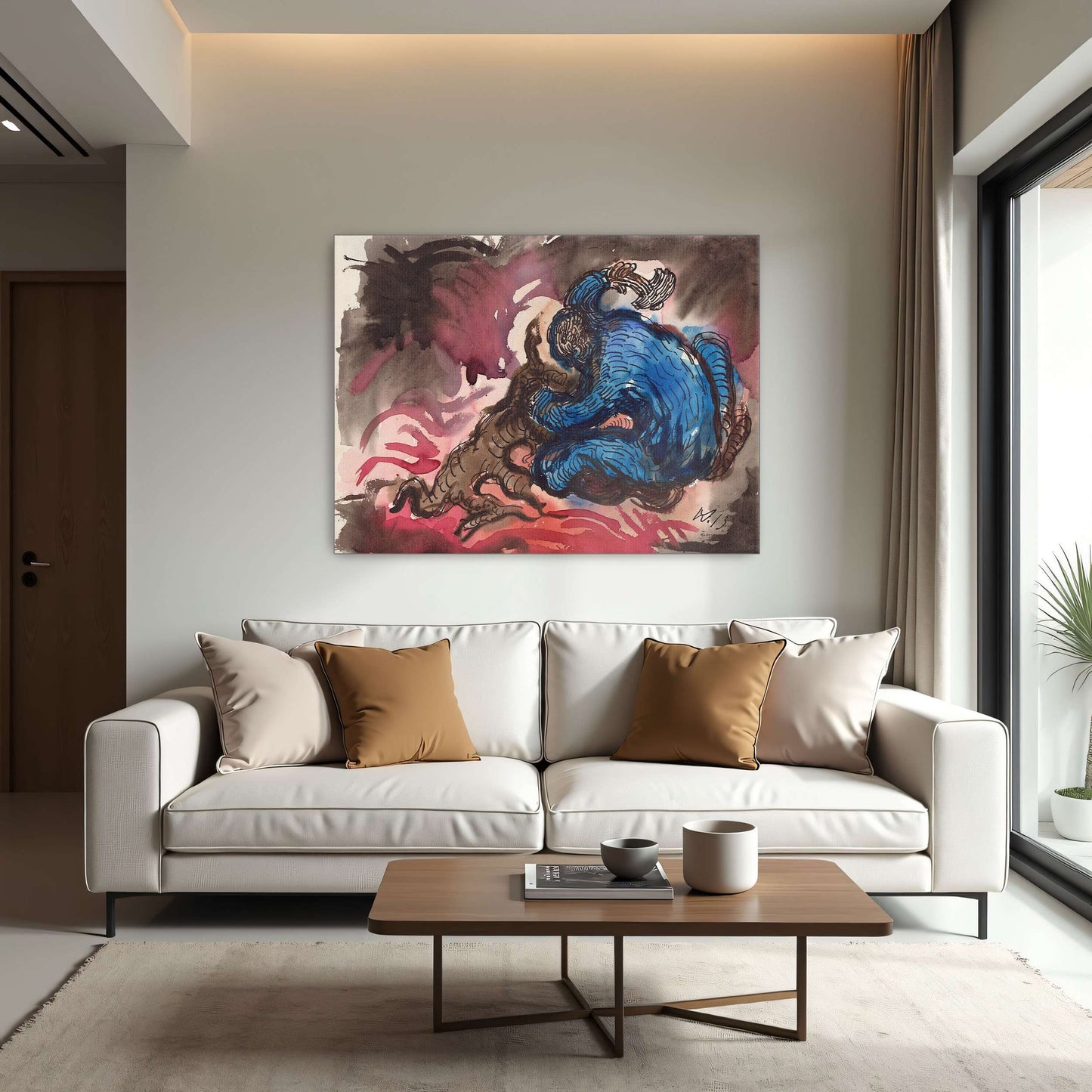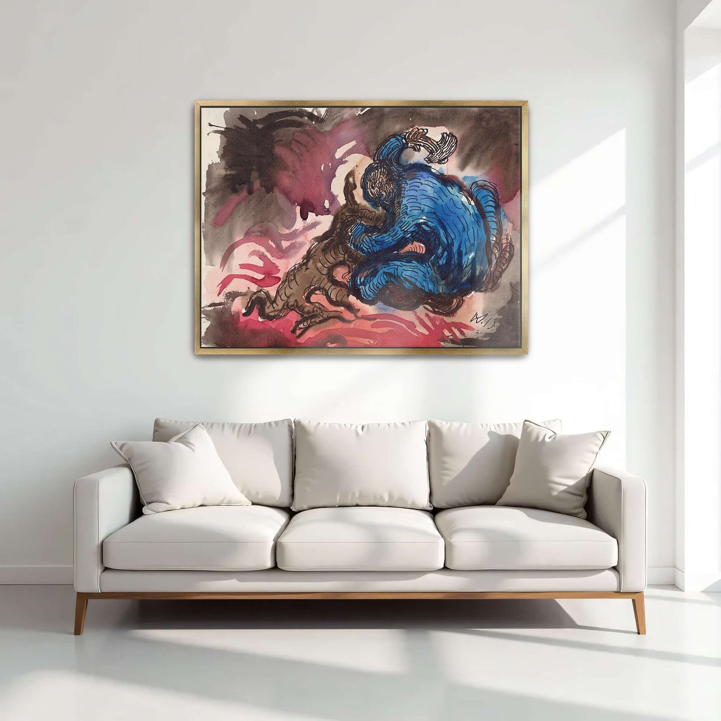 Blue Figure Wrestling With A Dark Creature In A Red And Brown Landscape By Wilhelm Morgner