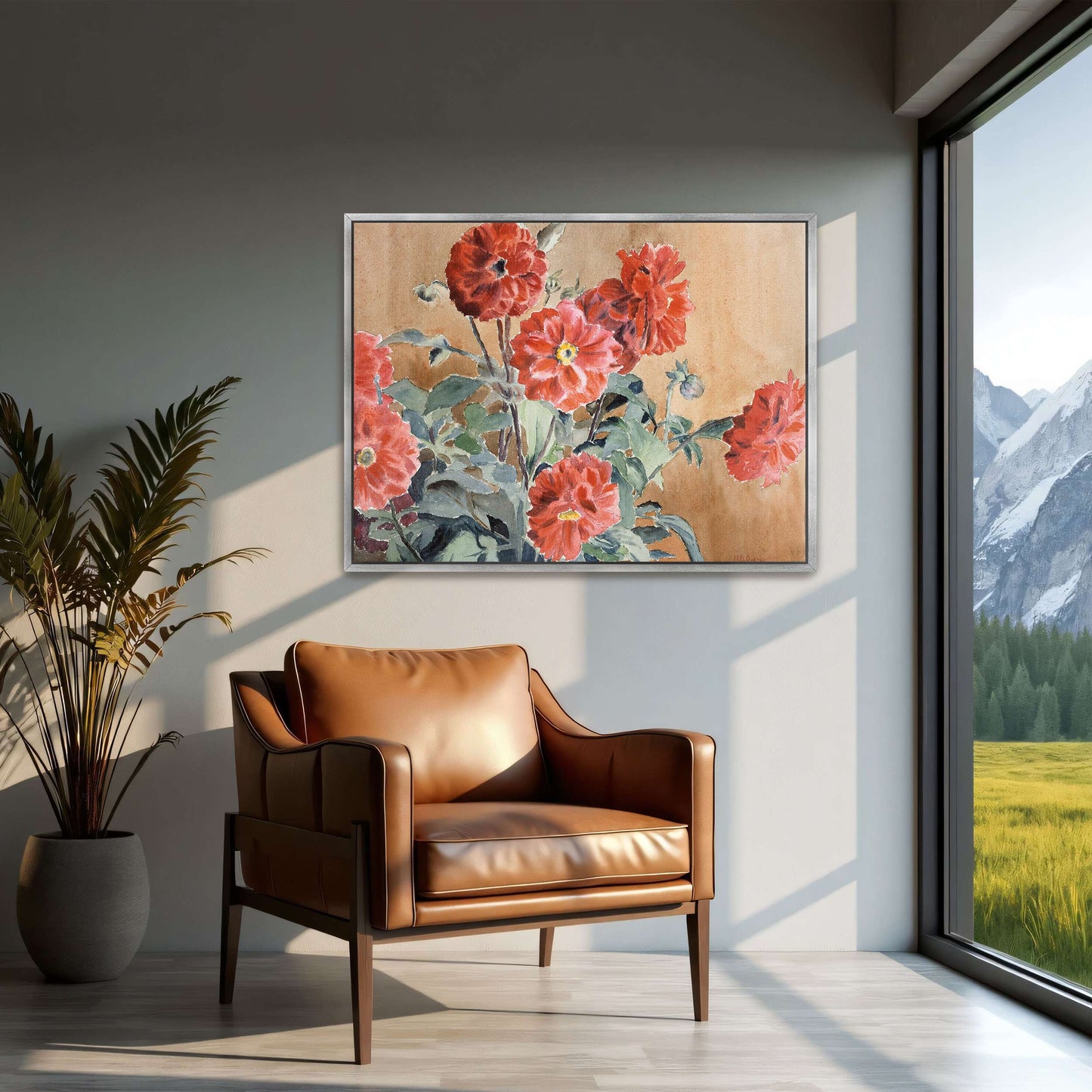 Red Dahlias In A Vase By Hannah Borger Overbeck